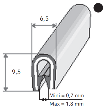F300020L Perfil clip EPDM negro para esp. 0.7->1.8 mm – 6×9 mm – 50 m