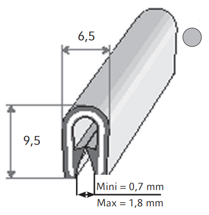 F300021L Perfil clip EPDM gris para esp. 0.7->1.8 mm – 6×9 mm – 50 m